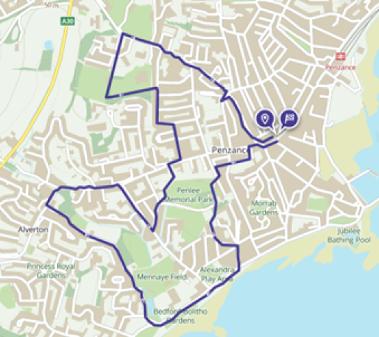 Start the walk by leaving Lloyds Bank or Market House (see note 1) west to Green Market. This is the original centre of Penzance and used to measure the half mile to its original boundaries. The Market Cross was located here and subsequently moved to Penlee Gardens, which you will pass later was used as the centre point for Penzance’s boundaries.