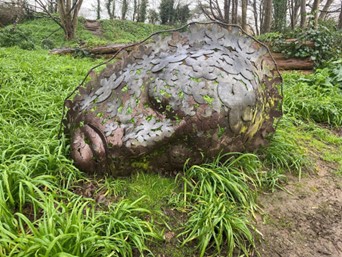 Walk up Penalverne Avenue keeping on the left-hand pavement. Between numbers 4 and 5 Penalverne Avenue is a small back lane. This looks like a service lane for the houses but turn left into it, turn right then left into a small wood. As you enter on your left is the head of a lady in copper lying on her side (see note 11).